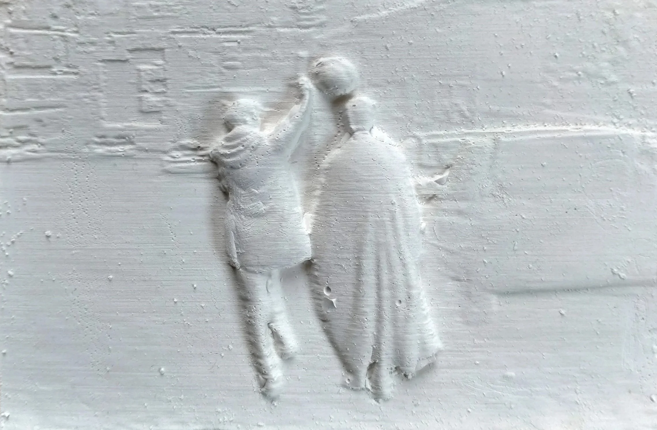 Una forma di socialità informale e non istituzionalizzata, in cui una comunità si riconosce attraverso un gesto insieme ludico e profondamente politico. In Eurasia Marisaldi fissa una serie di bassorilievi in gesso di sei fotogrammi tratti da un video divenuto virale, diffuso in rete da due giovani iraniane nel contesto della cosiddetta “primavera araba”. La scena, ambientata in una strada di Teheran, mostra una ragazza che riprende l’amica mentre, correndo alle spalle di un imam, con un gesto rapido e leggero gli fa cadere il turbante, per poi proseguire la propria corsa. Si tratta di un’azione minima e non violenta, una performance effimera insieme irriverente e giocosa, in cui la temporanea destabilizzazione di un segno visibile dell’autorità religiosa si traduce in un atto simbolico di dissenso, affidato alla leggerezza del corpo e alla fugacità dell’immagine.